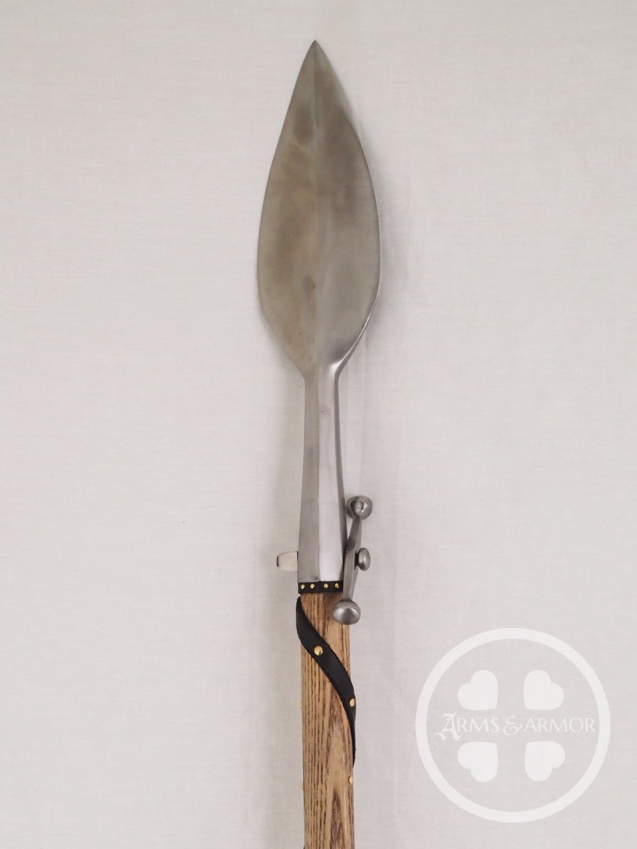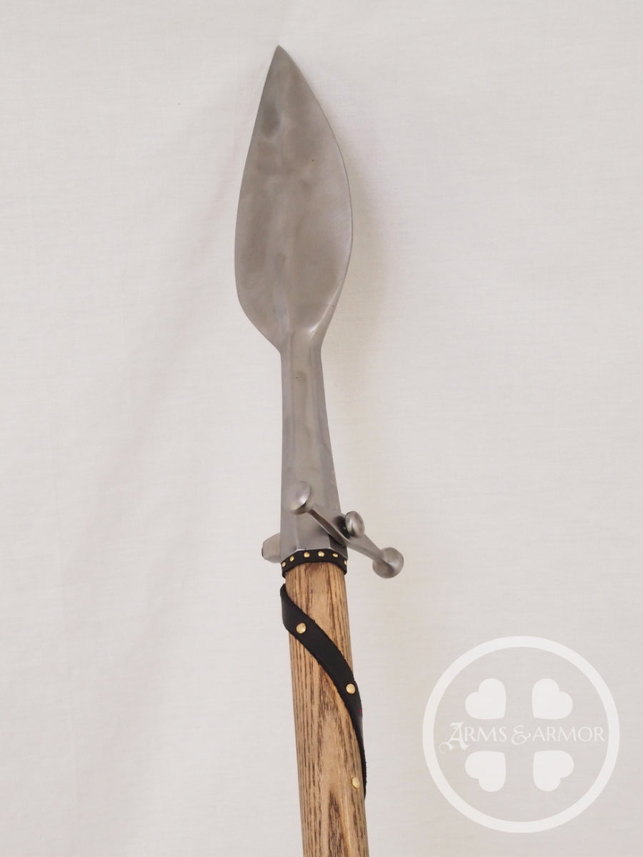 The leather spiral riser and bands on the haft facilitate the ability to position and handle the spear as depicted in fight manuals such as Talhoffer's Personal Manuscript 1459 in the mixed weapons section.