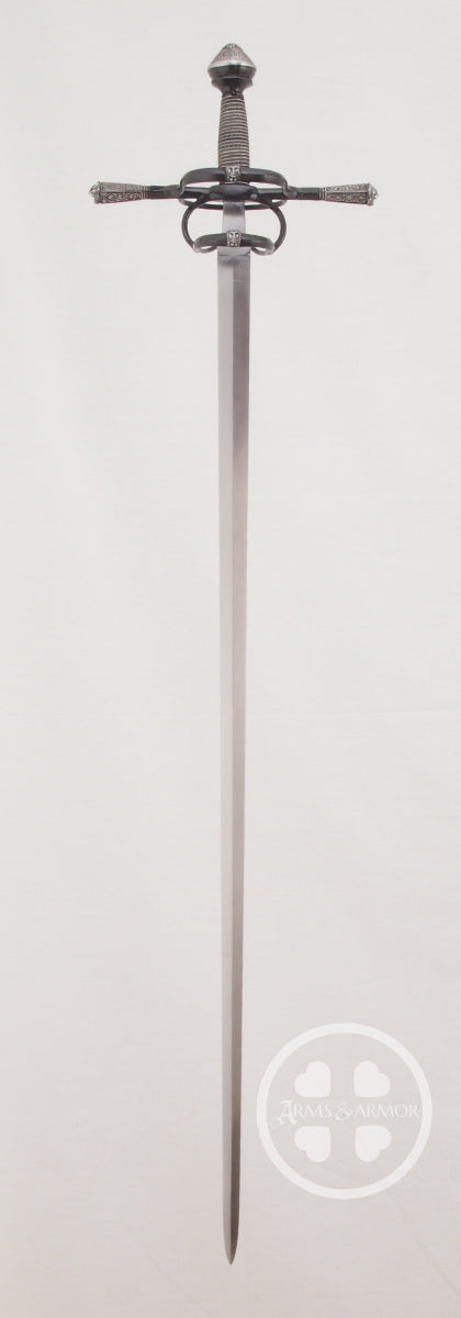 Elected King of Sweden on June 6th 1523, Gustav Vasa (1494-1560) had led the Swedish people to independence from the Danish King. This elegant replica depicts the personal weapon of King Vasa. It is an excellent example of the side sword style of rapier designed for cut and thrust fencing. Our all-steel replica is blued and accented with bright steel lion and medusa heads on the guard. This striking combination is fitted with a black and silver wire grip. A matching parrying dagger is also available.