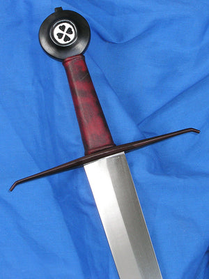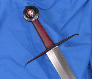 This piece has a wheel pommel that has been carved with a motto of the patron and had heraldic images painted in the recesses of the wheel. This was a common practice of the time. The contrast of the blued hilt and bright paint create a beautiful sword.